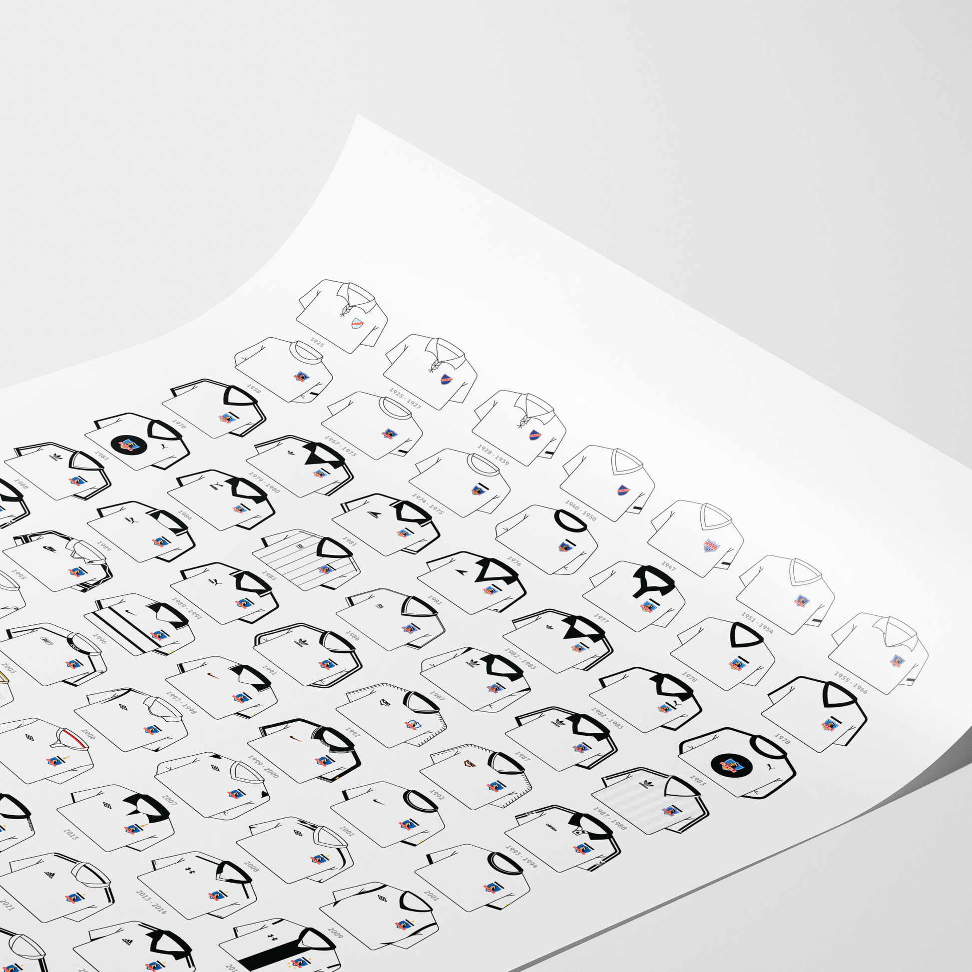 Poster con todas las camisetas albas usadas por Colo Colo desde su fundación en 1925.