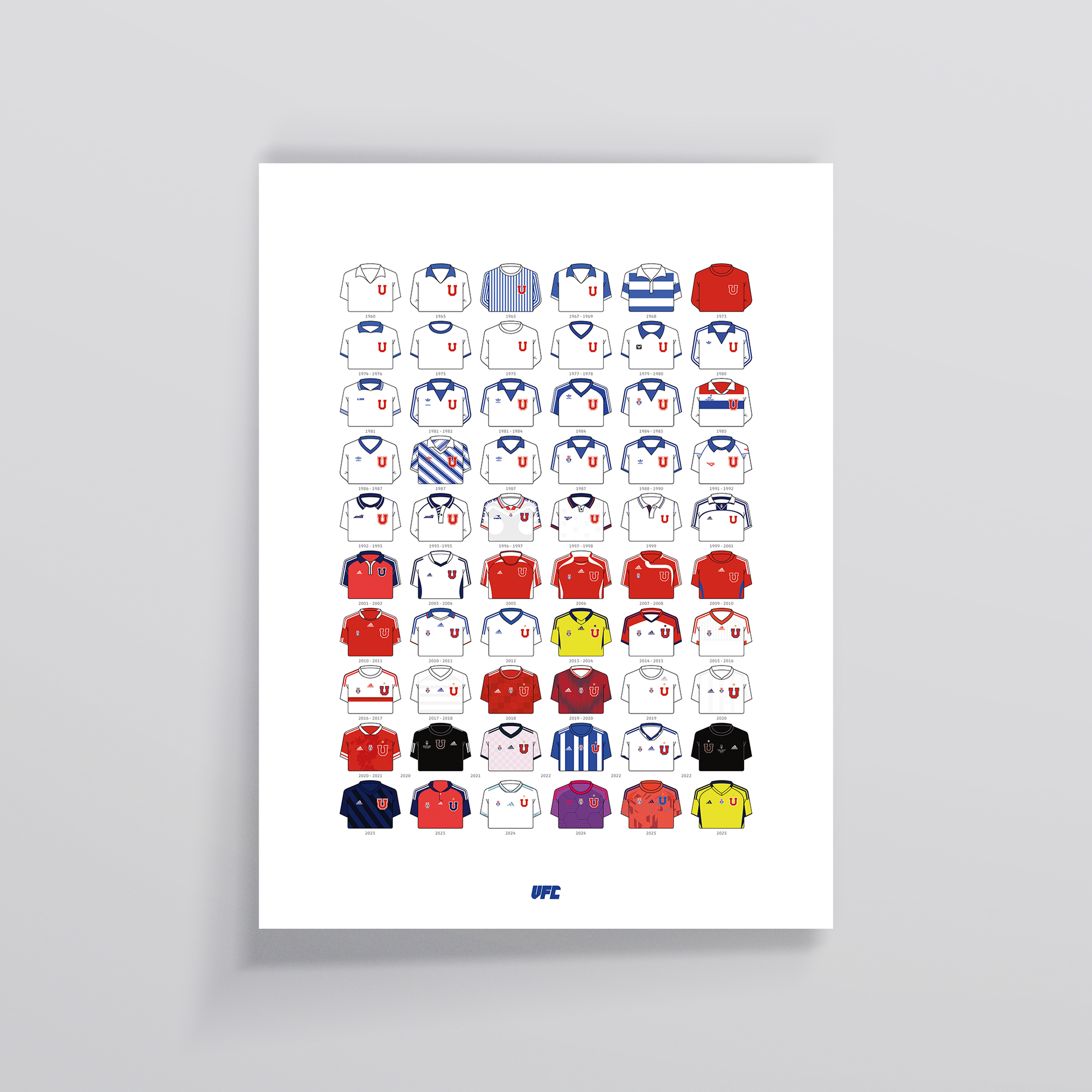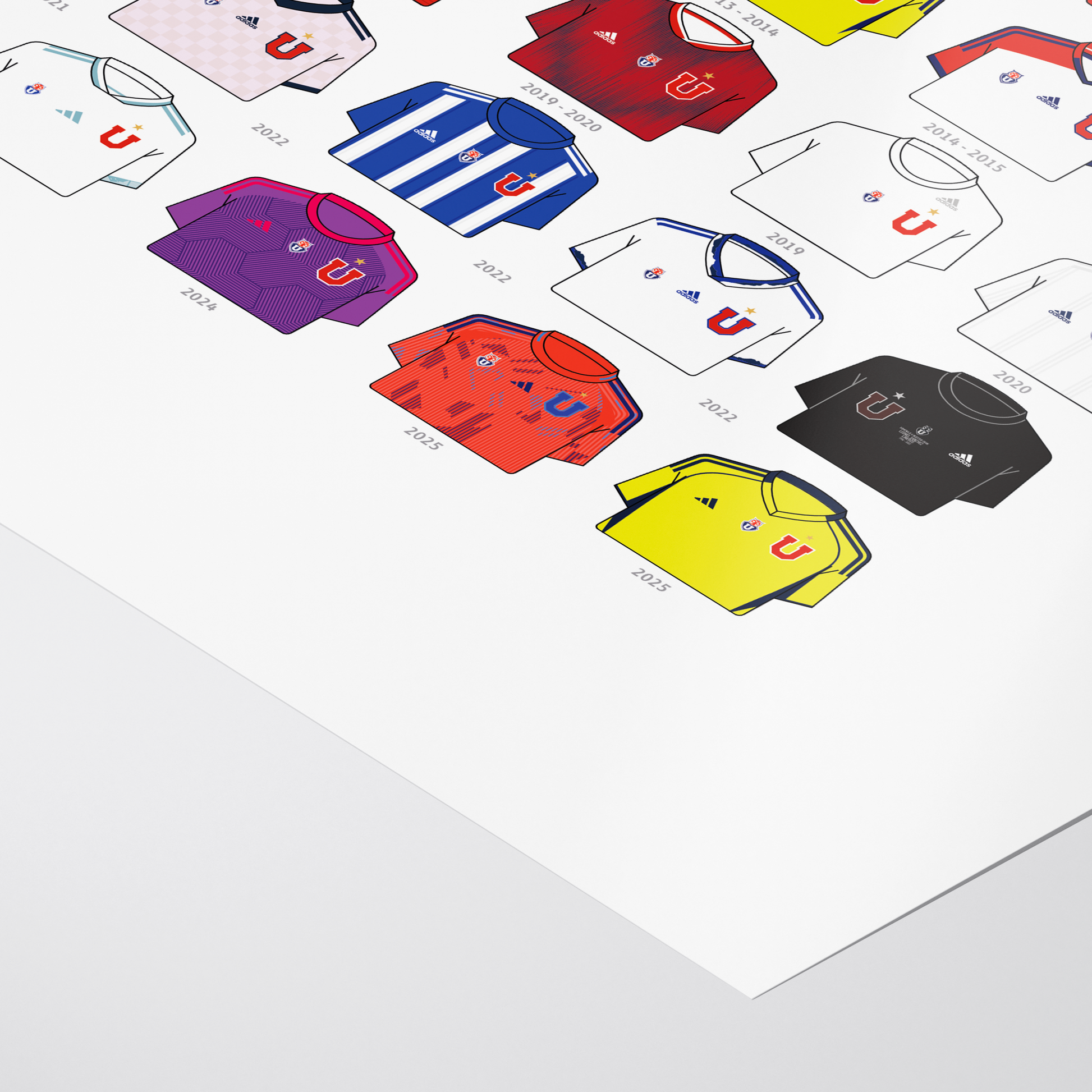 Poster con todas las camisetas de visita y alternativas usadas por Universidad de Chile desde 1960.