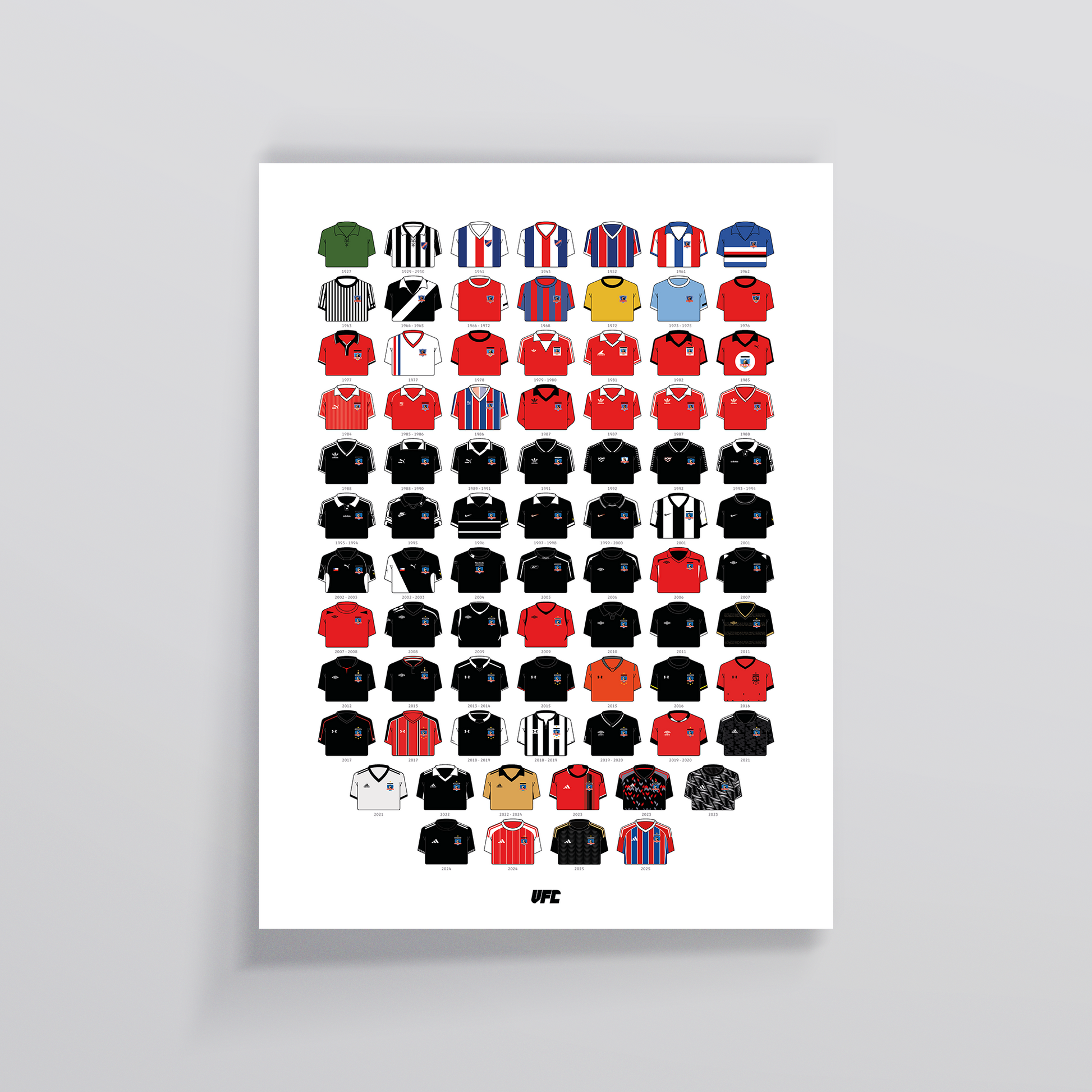 Poster con todas las camisetas de visita y alternativas usadas por Colo Colo desde su fundación en 1925.