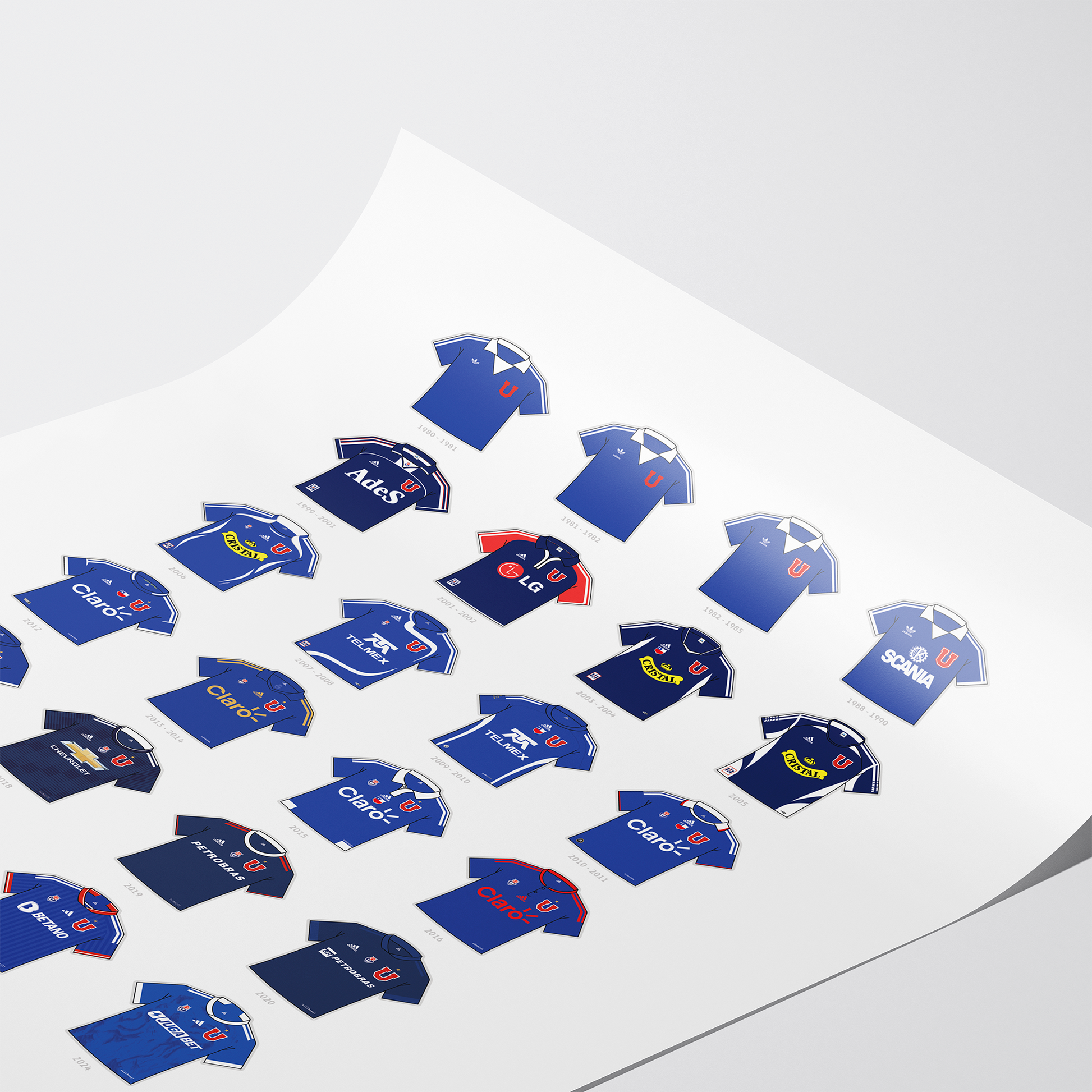 Poster con todas las camisetas Adidas usadas por la U. de Chile.