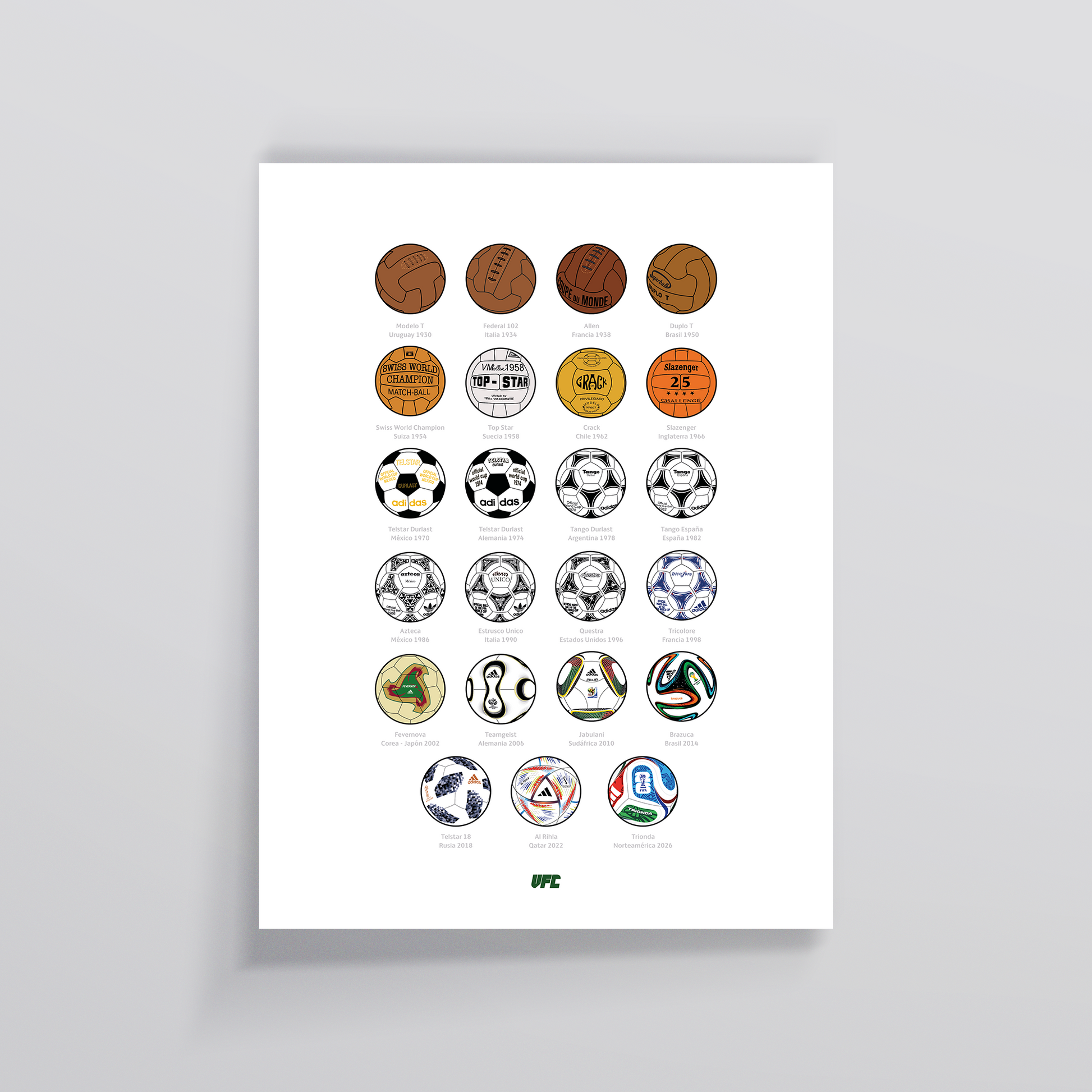 Ilustración de todas las pelotas usadas en los mundiales de fútbol, desde la primera en Uruguay, hasta la próximo que se usará en Norteamérica 2026.
